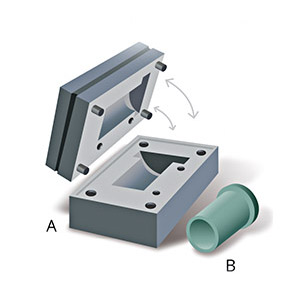 A tool is built to customer-provided specifications (A). Cold wax is then injected into the tool to create a wax pattern/prototype (B). That will hold precise dimensional requirements in final casting.