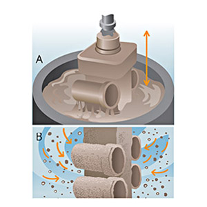 Successive layers of ceramic (A) and are applied to the sprue assembly to form a hard shell.